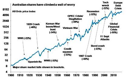 Related to this, shares climb a wall of worry over many years with numerous events dragging them down periodically, but with the long-term trend ultimately up & providing higher returns than other more stable assets. Bouts of volatility are the price we pay for the higher longer-term returns from shares.