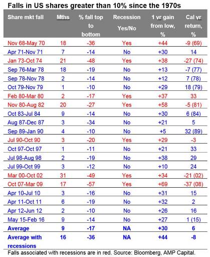 Second, the main driver of whether we see a correction (a fall 5% to 15%) or even a mild bear market (with say a 20% decline that turns around relatively quickly like we saw in 2015-2016) as opposed to a major bear market (like that seen in the global financial crisis (GFC)) is whether we see a recession or not – notably in the US. The next table shows US share market falls greater than 10% since the 1970s. I know it’s a bit heavy – but I like this table! The first column shows the period of the fall, the second shows the decline in months, the third shows the percentage decline from top to bottom, the fourth shows whether the decline was associated with a recession or not, the fifth shows the gains in the share market one year after the low and the final column shows the decline in the calendar year associated with the share market fall. Falls associated with recessions are highlighted in red. Averages are shown for the whole period and for falls associated with recession at the bottom of the table.