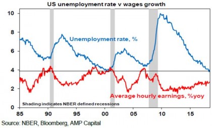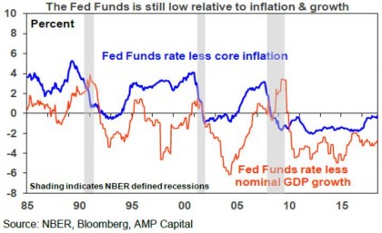 Apart from the amber lights flashing from the flattening yield curve and very low unemployment our assessment is that a US recession is still some time away as it will take time for excesses to become extreme and US monetary policy to become tight. Looked at another way, the US is still more likely to overheat before it goes into recession. We have been thinking recession is a 2020 risk. The end of the current fiscal stimulus around then would also be consistent with this. However, given the current slow pace in terms of building excess, that 2020 is a presidential election year – do you really think Trump will allow the US to go off a fiscal cliff then? – and with 2020 being the consensus pick for a downturn, the risk is that it comes later. Of course, an escalating trade war could mess things up earlier, although we still see a negotiated solution. The rising US budget deficit is a concern but it’s more of an issue for when the economy turns down as this is when investors will start to worry about its sustainability. And of course a 1987 style share market crash cannot be ruled out but probably requires a share market blow off before hand. In the meantime, the Fed has more tightening to do and while sharemarket volatility is likely to remain high as US inflation and short rates rise, excesses gradually build and given risks around Trump and trade, with recession still a way off the US and global share bull market likely still has some way to go.