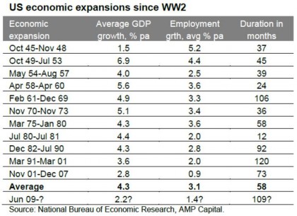 The cyclical bull market in US shares is now over nine years old. This makes it the second longest since WW2 and the second strongest in terms of percentage gain. And according to the US National Bureau of Economic Research the current US economic expansion is now 109 months old and compares to an average expansion of 58 months since 1945. See the next two tables. So, with the bull market and the economic expansion getting long in the tooth it’s natural to ask whether it will all soon come to an end with a major bear market.